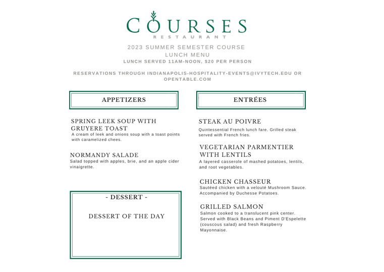 Courses Restaurant will be open for lunch every Thursday, from 11 a.m. to 12 p.m. through July 20, beginning June 22. Reservations are required through OpenTable or by emailing Indianapolis-Hospitality-Events@ivytech.edu.